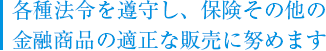 - 保険業法、金融商品の販売等に関する法律、消費者契約法、金融商品取引法、個人情報の保護に 関する法律、その他の関係法令等を遵守します。
